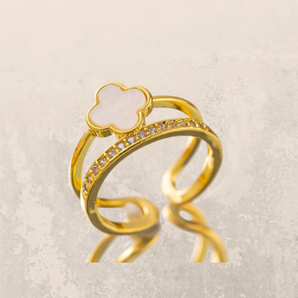 O anel aro duplo com trevo e zircônia é uma peça encantadora que combina estilo e simbolismo.