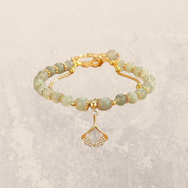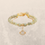 Pulseira esferas verdes com pingente leque/corrente/divisores dourados